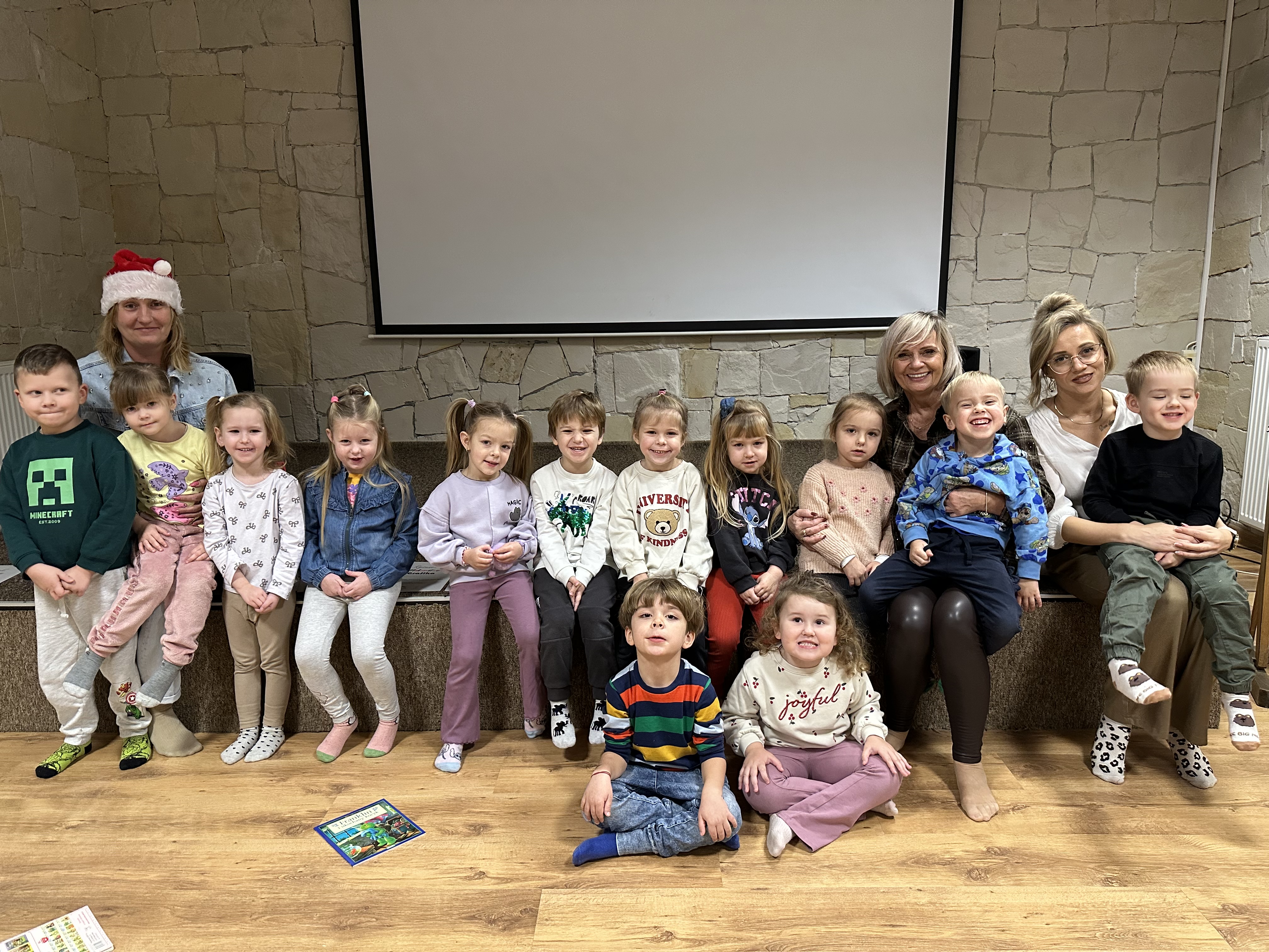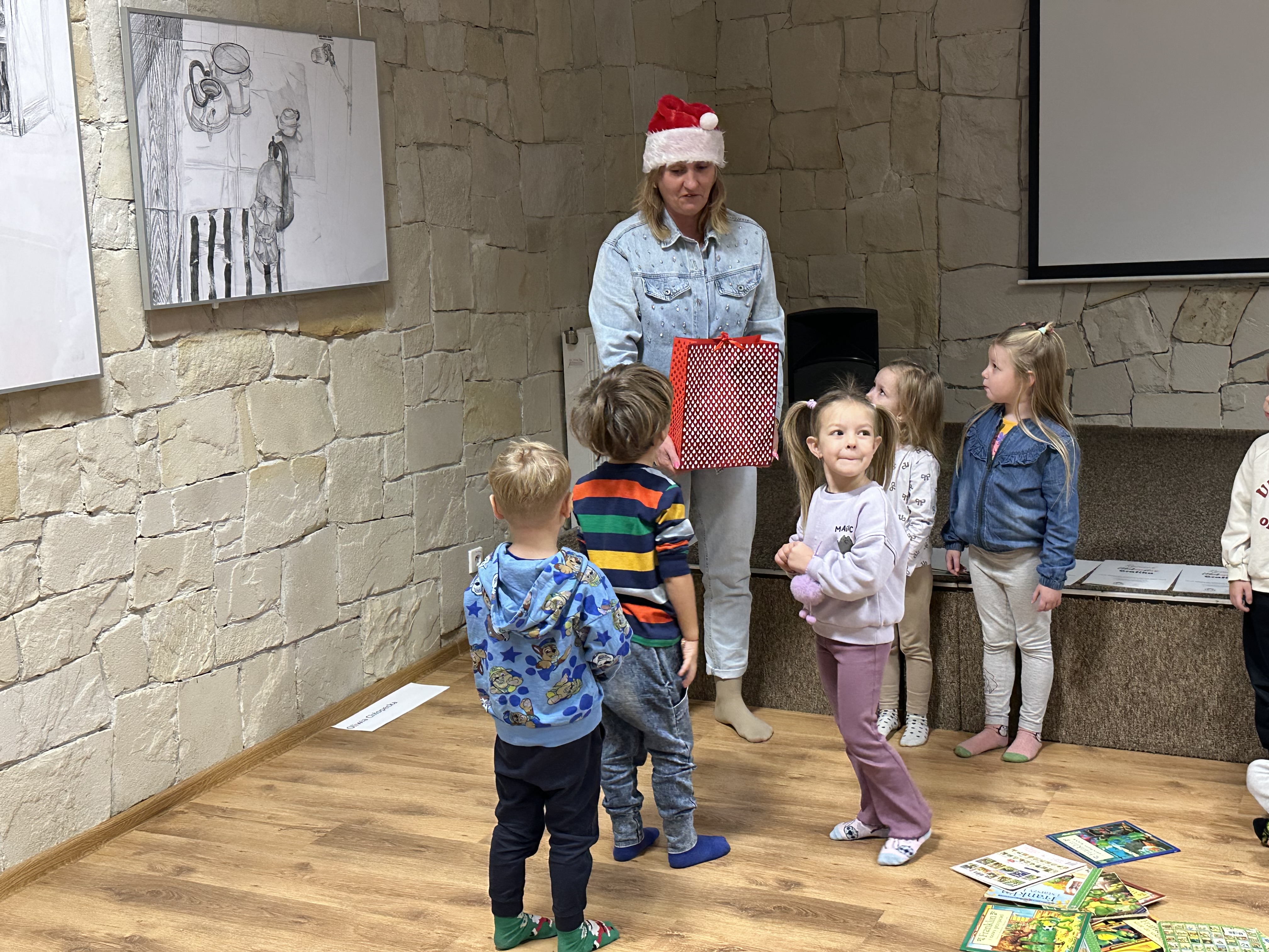Dzieci wręczyły Mikołajkowy prezent pani Dorotce dziękując za świetną zabawę