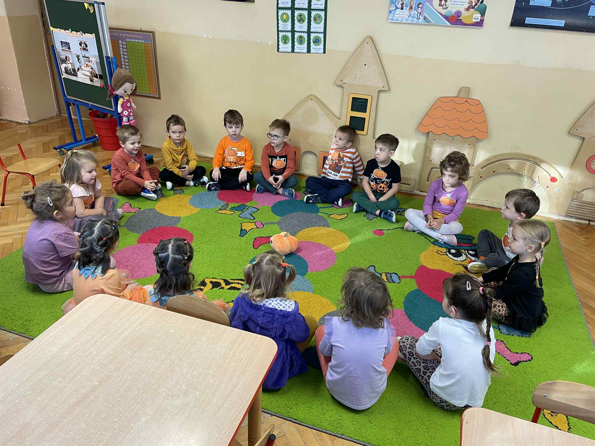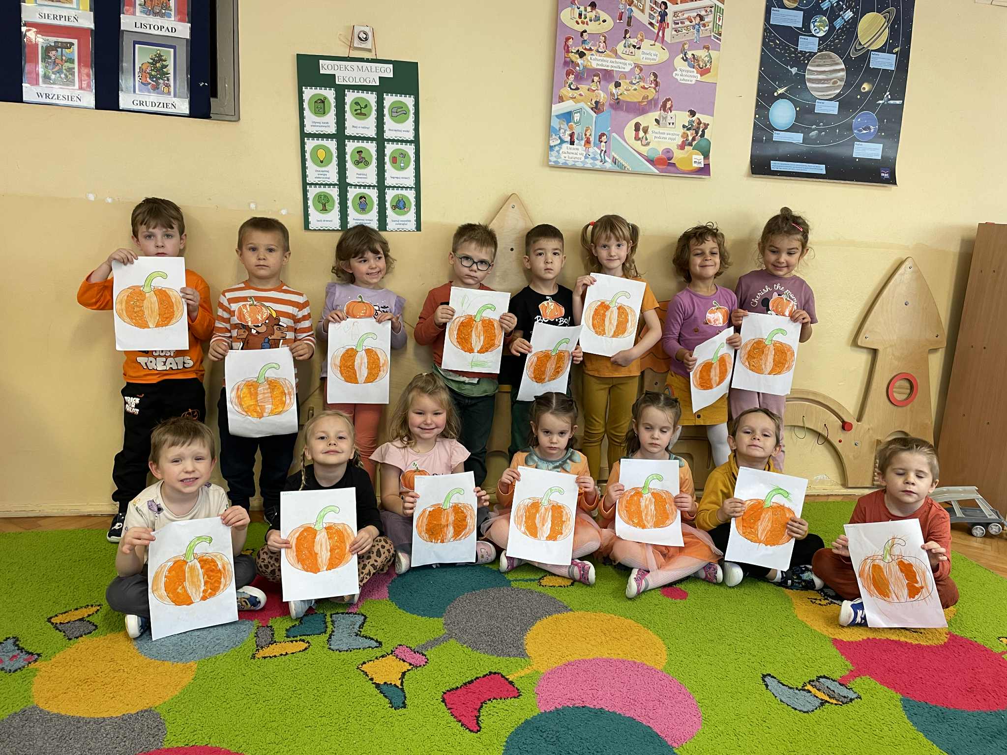 Świętując Dzień dyni samodzielnie ozdabiały dynie na kartonie.